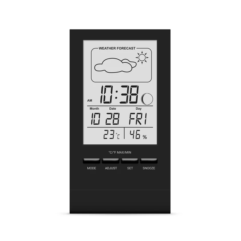 Термо-гігрометр T-14 - допомагає відслідковувати дані про домашній мікроклімат. На екрані пристрою відображаються не тільки інформація про температуру і вологість, але і поточна дата, час і фаза місяця. Виконує функцію будильника.