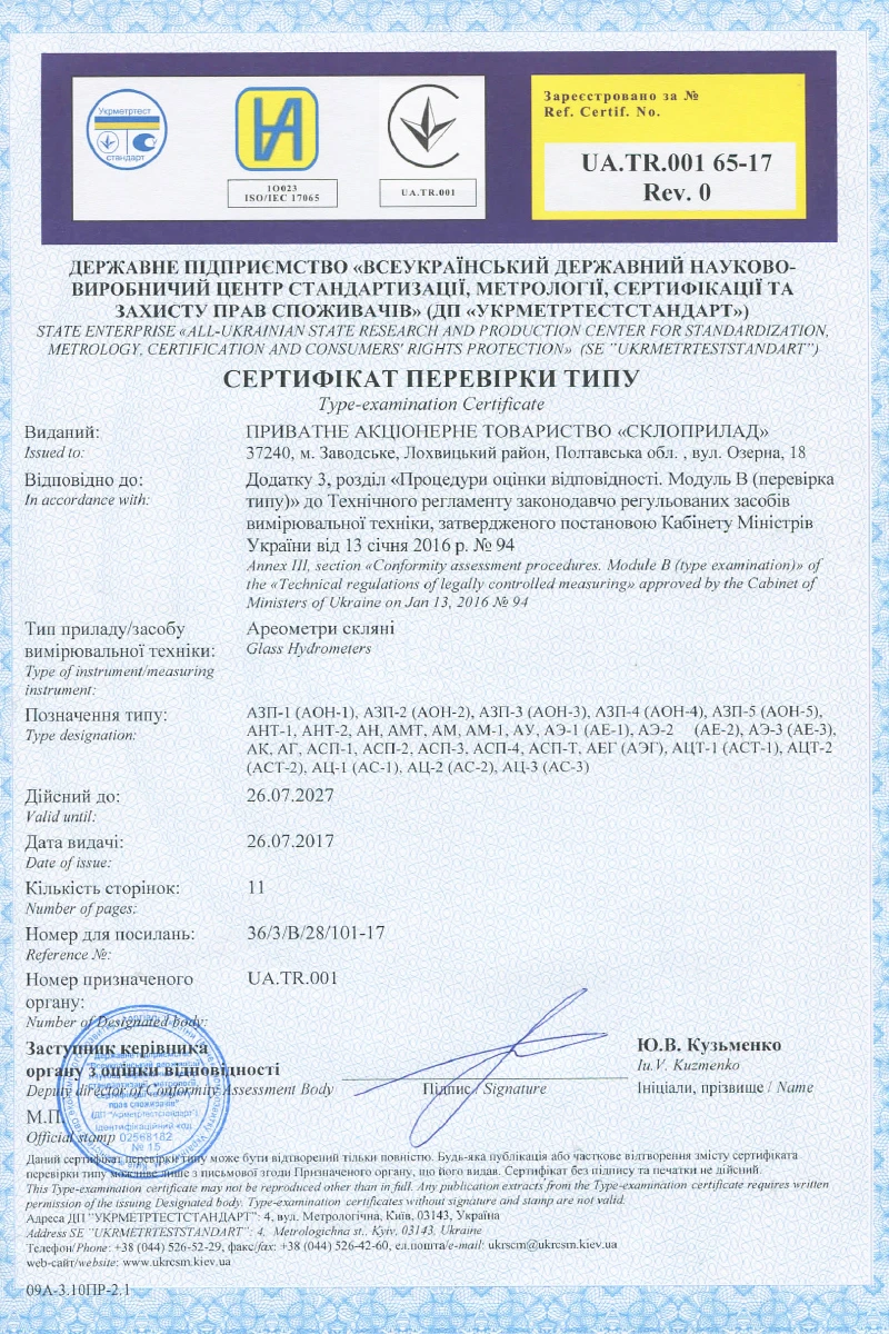 Сертифіковані ареометри. Міжповірочний інтервал 5 років.